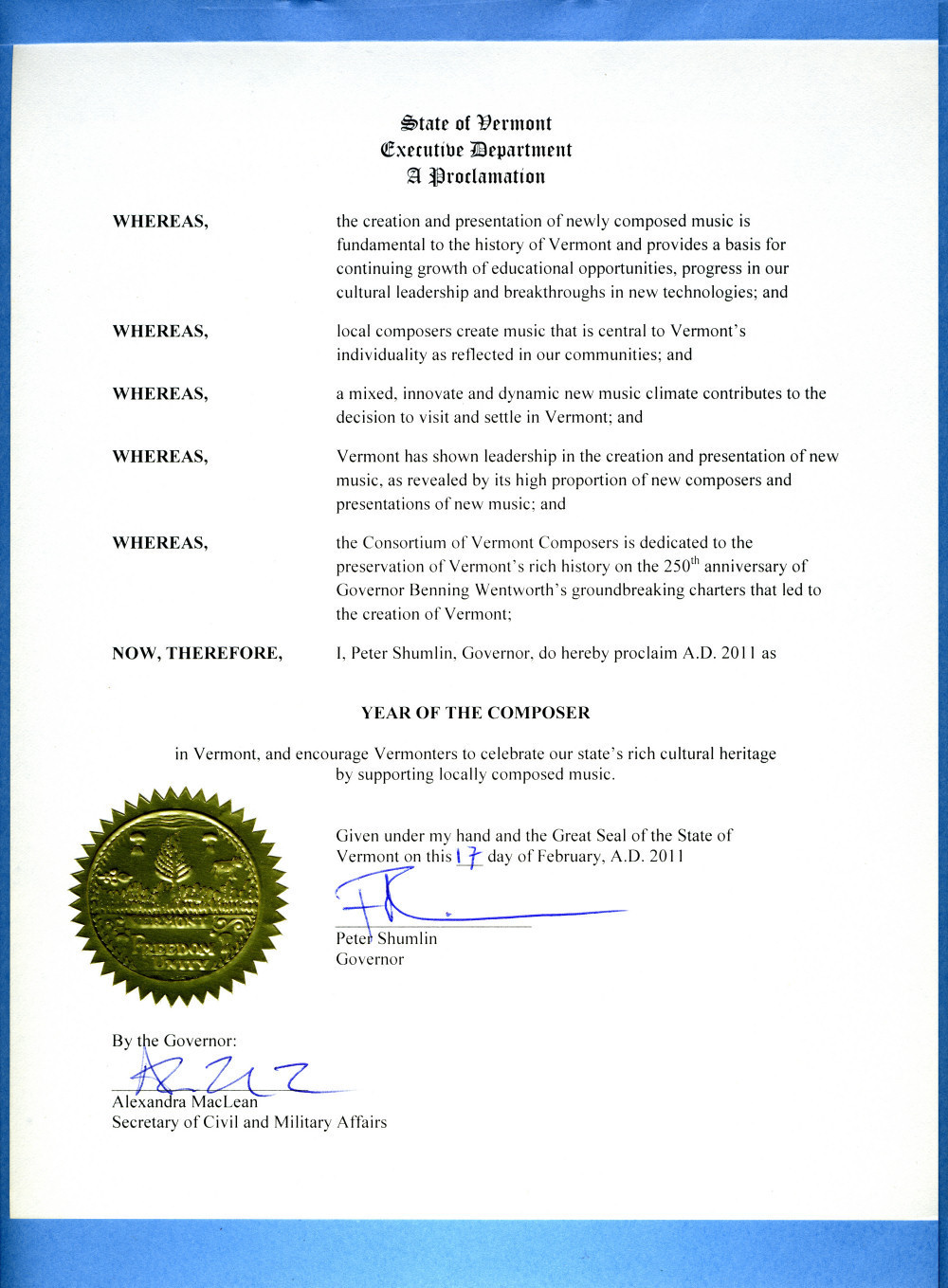 The Consortium of Vermont Composers was founded in 1988 to get new music out there from in here. Did you know that nearly 250 composers live and work in Vermont, with music ranging from the straightforward song to the electronic edge? Yes, they do! We're the most composer-friendly state in the U.S.! The Consortium occasionally publishes Consorting, a newsletter of musical ideas, jousts, reviews & announcements, and will have a new issue out in the spring of 2005. Becoming a member of the Consortium is inexpensive -- use this form to contact the Consortium. Large sums of money, artistic contributions, lip-slathering commissions and general bewilderment are also welcome. The Consortium of Vermont Composers can be reached for scores, recordings, and music samples.